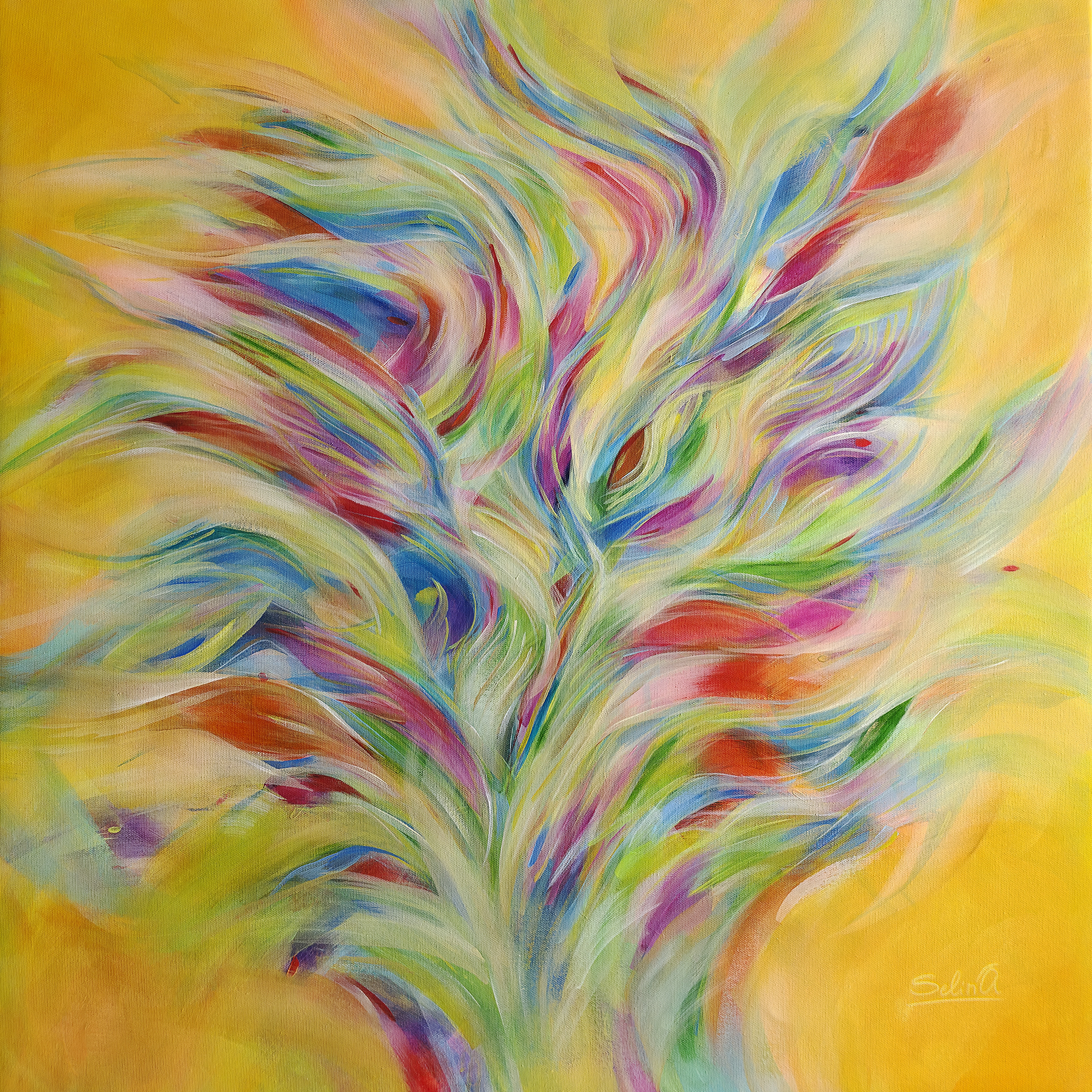 The palette — shades of green, blue, pink, purple, and orange — clash and harmonize, inviting the eye to wander and resonate with the shifting flows of light. The radiant yellow background enhances the brightness, giving the composition a sense of sunny presence and life-giving warmth.