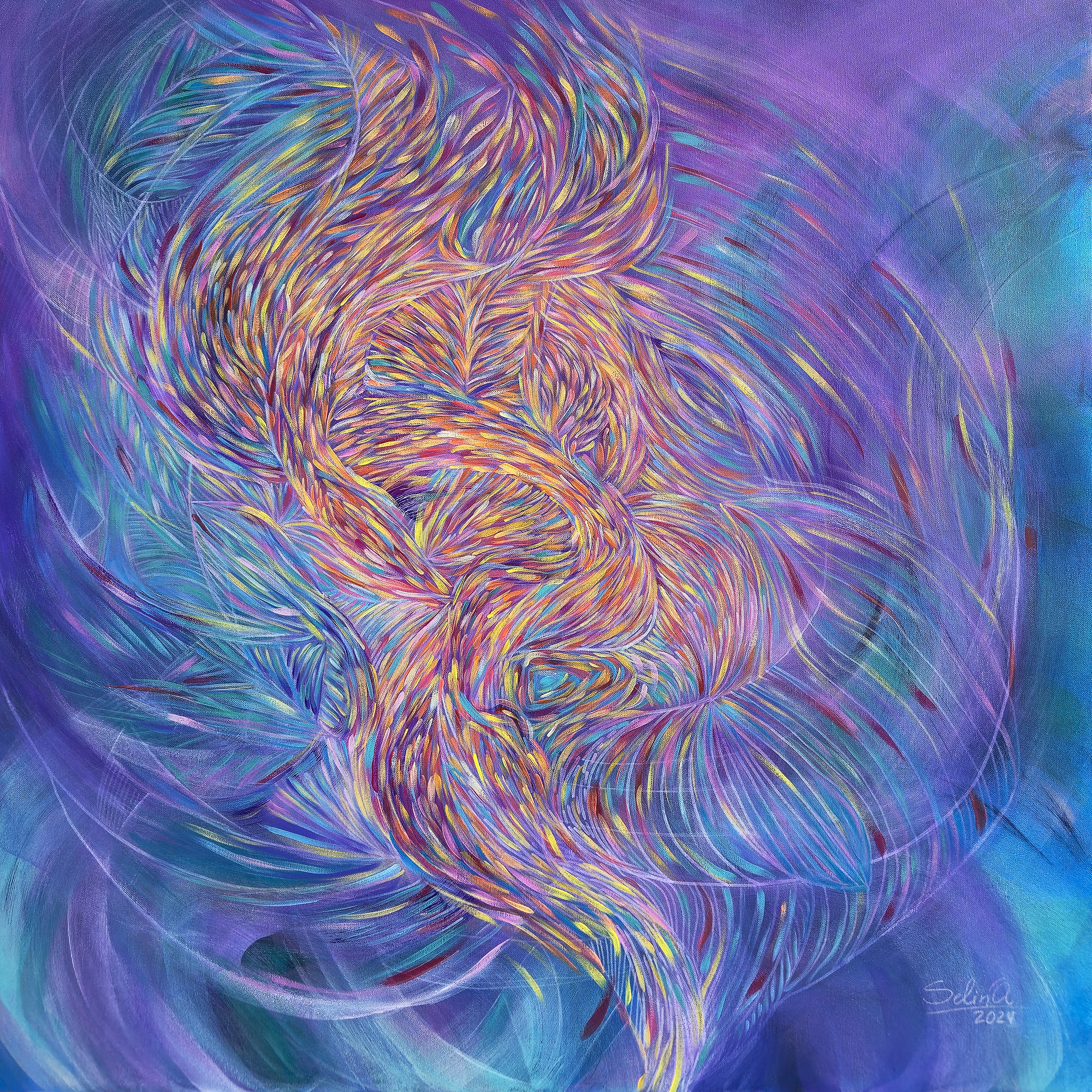 The composition balances turbulent motion with meditative focus, making color itself the subject of renewal. Signed by the artist in the lower right corner.