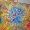 This vibrant artwork is an explosion of color and energy, captivating viewers with its swirling patterns and dynamic movement. The centerpiece features a flash of electric blue, encircled by twisted ribbons of fiery orange, deep violet, and radiant yellow. These vivid shades blend smoothly, creating a sense of fluidity and continuous motion. The composition, reminiscent of a cosmic explosion, evokes both chaos and harmony simultaneously.