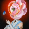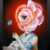 An elegant female image in a light blue rococo dress sits at a table, leaning her hands on it. Her head is a large ranunculus in pastel pink and yellow shades with a green heart. On the outstretched arm is a tied thread on which a blue butterfly hovers. The background glows with a rich red-orange glow, symbolizing the energy and vitality of spring. The painting embodies an atmosphere of innocence, dreaminess and the connection of man with nature through fragile, ephemeral images.