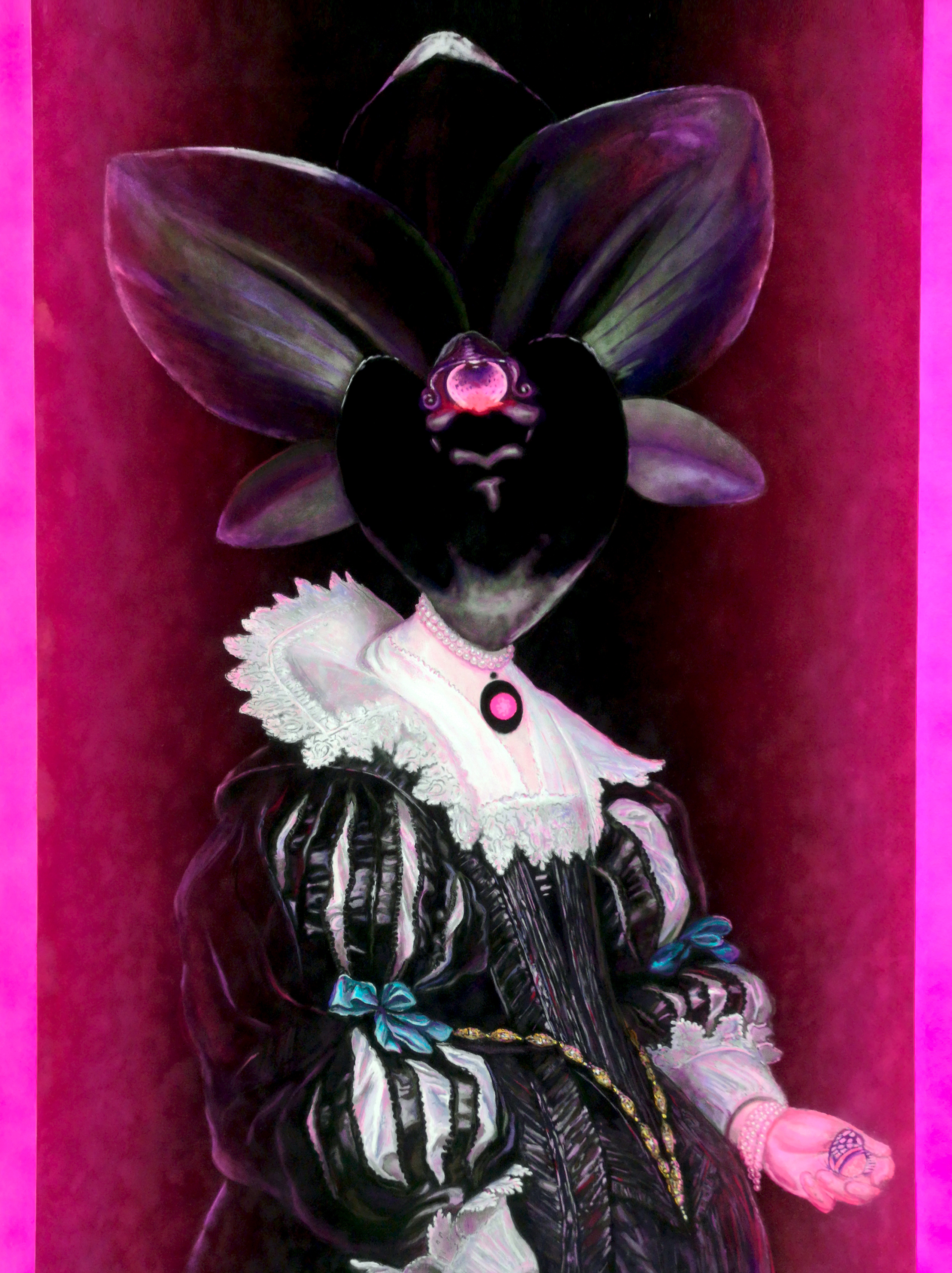 This painting is made in a rich range of deep purple, burgundy and black tones. In the center is a female figure in an elegant, richly draped baroque dress with puffy sleeves. The woman's face is replaced by a luxurious black orchid with a purple glow - the flower seems to continue the richness and mystery of the dress itself. The work is filled with mystery, creates an association with the image of a secret queen or an enigmatic stranger, subtly playing at the junction of a classical portrait and symbolist allegorism.