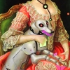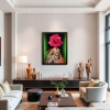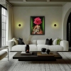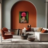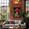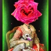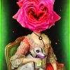 A classic female portrait in a lush Renaissance dress with an abundance of lace and pearls takes on a surrealistic tone: the heroine's face is a huge pink rose, and in her arms she is holding not a living animal, but a robot dog. The neon-greenish glow of the background emphasizes the unusualness of the scene, combining living nature and the technogenic world. The artistic play of contrasts between luxury and industrial aesthetics, natural organics and the cold shine of technology emphasizes the theme of the evolution and transformation of the female image in the 21st century.