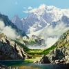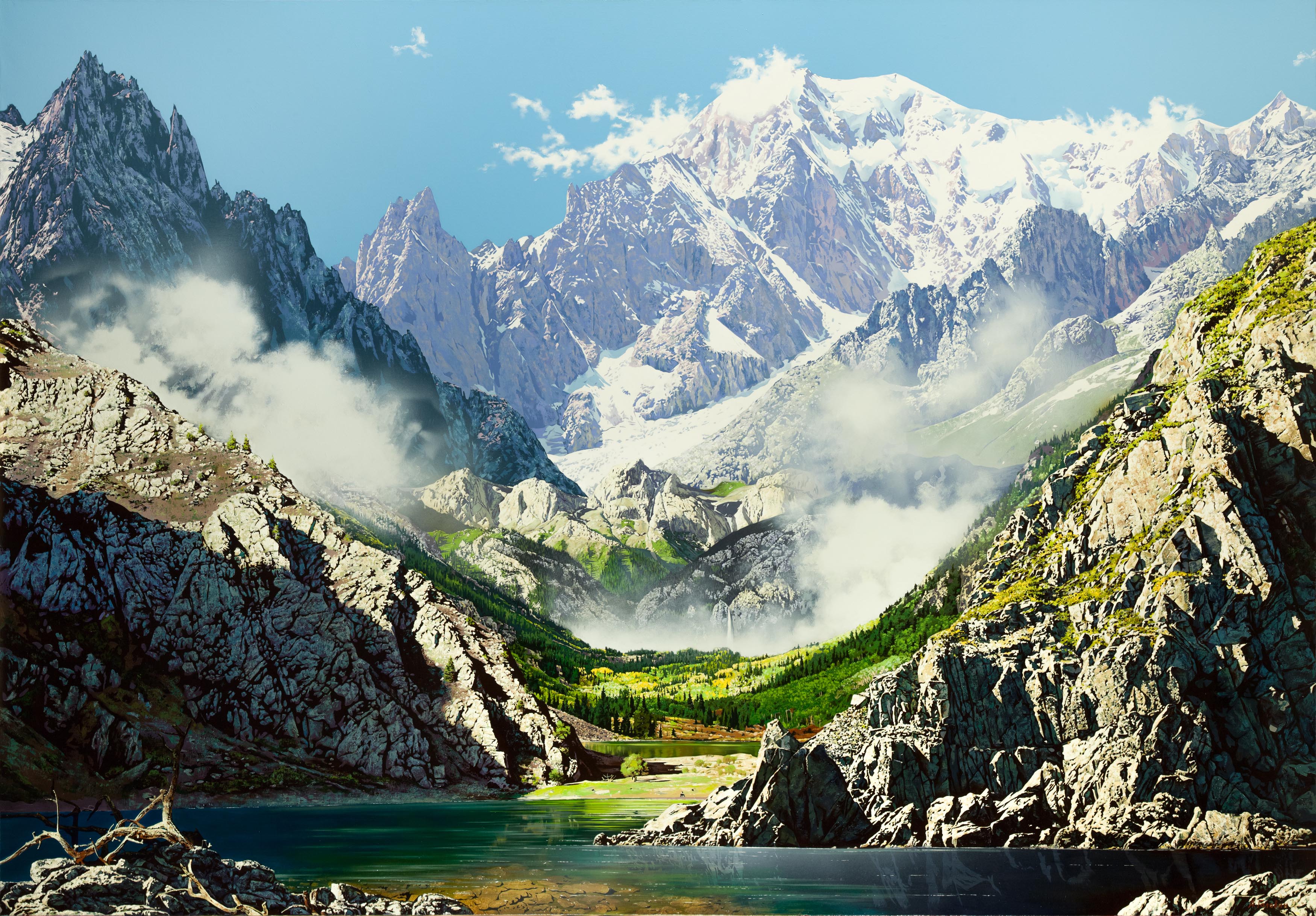 The viewer is presented with a majestic mountain landscape, where snow-capped peaks rise to the sky like stone guardians protecting the wild expanses. The sun softly illuminates the slopes, emphasizing the texture of the rocks and glaciers, playing on the shadows. The sky is bottomless blue, with thin clouds creeping in the hollows between the mountains. In the center, a valley with young green vegetation is visible, and at the foot lies a calm turquoise lake. This landscape breathes freedom, the grandeur of nature and a sense of solitude, inviting reflection and inspiration.
