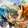 A lush and dynamic composition inspired by the myth of the abduction of Europa. In the foreground is a young naked woman, in the guise of Europa herself, riding a mighty bull, symbolizing Zeus. Around them, the sea elements rage: a wave of waves from which dolphins, swordfish, sea turtles appear - all testify to the presence of mythological water forces. Snow-white and orange draperies flutter in the wind, giving the scene an effect of movement and theatricality. The female figure is full of stately grace and innocence, and the fresh sea air and play of light give the painting a special feeling of freedom and grandeur of the ancient myth.