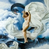 A naked woman is depicted against the backdrop of a stormy ocean and splashes of water - a symbol of purity and vulnerability. She shyly raises her hands, as if hiding or dancing, a giant sea snake with an open mouth and sharp fangs curls around her, as if entering into a mystical dance with the heroine. The image is complemented by a light, almost airy white fabric that emphasizes the dynamics of the plot. In this scene, the tension of the moment between danger and beauty is felt. The background is the sea element, the foaming sea and the bright sky, which adds even more expression and symbolism to the work.