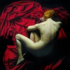 A nude figure curled up on luxurious, bright red fabric is depicted against a dark background in the center of the composition. The light emphasizes the graceful lines of the female body: a bare back, curved knees and a hand covering part of the face. The expressive play of light and shadow creates a feeling of almost sculptural plasticity and fragility at the same time. The red fabric is unfolded in intricate folds, contrasting with the porcelain pallor of the skin. The image is filled with vulnerability and some drama, there is a feeling of loneliness, inner security and intimacy of the moment. The painting makes a deeply emotional and aesthetic impression.