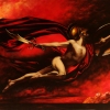 In the center of the dramatic composition is an ancient hero - a naked man in a golden helmet and a scarlet cloak. His powerful figure is tense in a jump, he flies over a dark red sky, in one hand he holds a curved sword, in the other - a round shield. The image of Perseus is inscribed in a whirlwind of scarlet draperies, behind him is a raging fire element. In the background are small buildings, which emphasize the scale and epic nature of what is happening. The work embodies heroism, swiftness and determination, as if the moment of battle or feat is frozen in time.