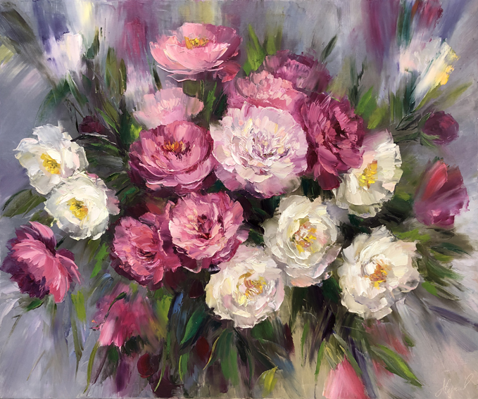 The painting "Renaissance" amazes with its exquisite elegance and tenderness of execution. A lush bouquet of pink and white peonies seems to float in a light haze, filling the space with an atmosphere of freshness, harmony and spring awakening. The artist masterfully uses soft color transitions and a rich palette of shades to emphasize the volume and velvety texture of the petals. Each flower in the bouquet is unique and expressive, the finest strokes of oil convey their natural beauty and grace. The light, transparent background gives the composition a special lightness and airiness, creating a sense of celebration and renewal. This painting will become a symbol of new life and a source of inspiration for any interior.