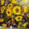 The painting "Sunflowers" is filled with the bright energy of a sunny summer. The artist masterfully conveyed the beauty and vitality of sunny flowers, collecting them in a spectacular bouquet. The petals of the sunflowers are painted with wide, rich strokes, literally radiating light and joy. The contrast of rich yellow with splashes of green and purple shades creates an atmosphere of freshness and vivacity. Attention to detail, the play of light and color make the still life surprisingly lively and voluminous. This painting seems to transfer the viewer to a warm summer day, fills the space with coziness and optimism, charging with positive energy. "Sunflowers" will become a bright accent of the interior, reminding every day of the beauty of nature and the joy of life.