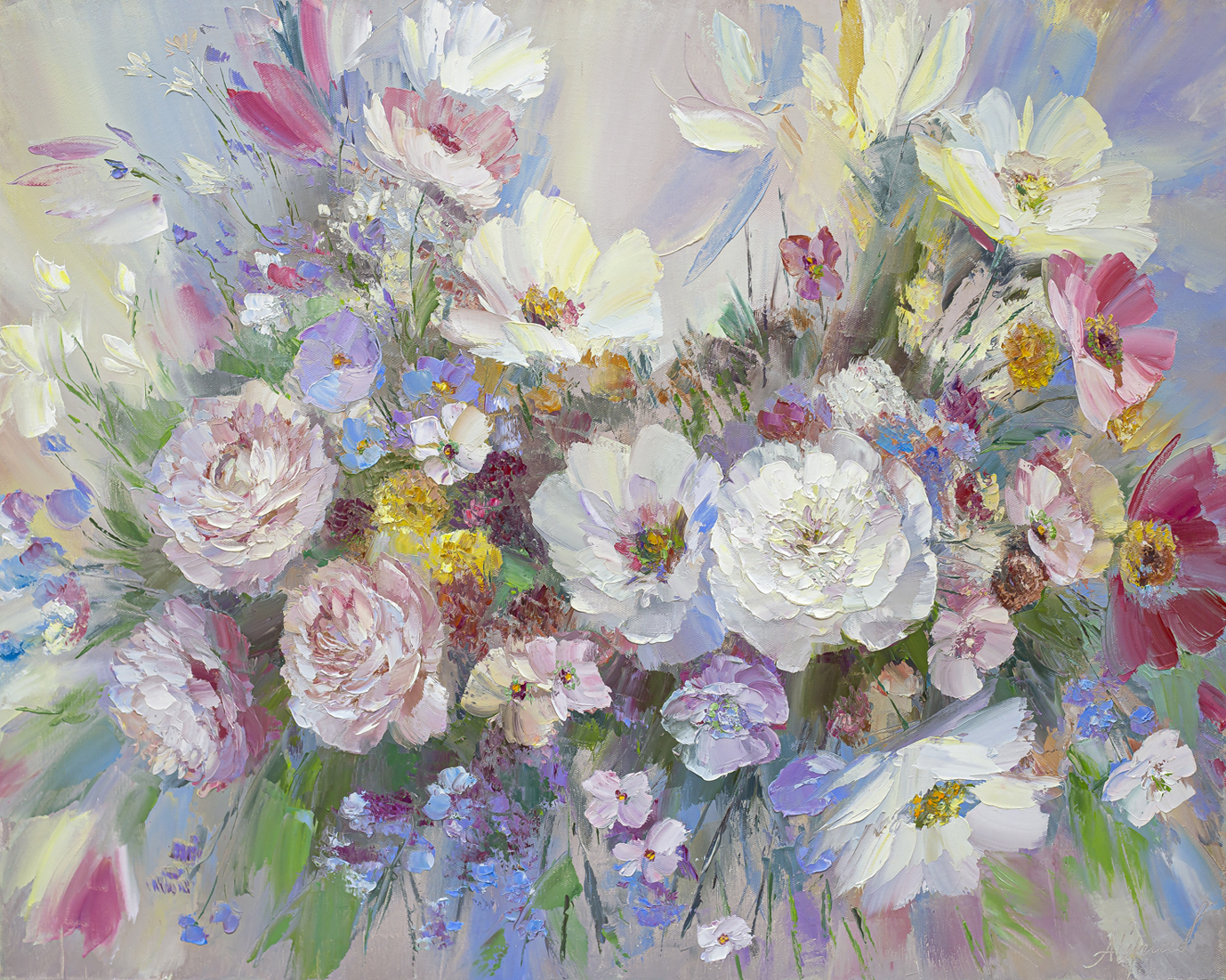 The painting "Breath of tenderness" is filled with amazing softness and lightness, like a fresh spring breeze. The artist masterfully conveyed the fragile beauty of flowers: delicate white, pink, blue and cream buds merge into a harmonious and airy composition. A light pastel palette, smooth transitions of shades and delicate work with texture allow the flowers to literally bloom on the canvas.