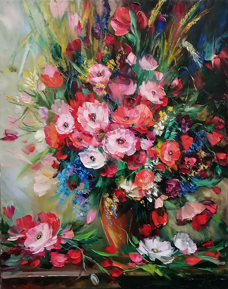 This painting can be hung on the wall of your apartment, house, office, restaurant, or hotel and will be a wonderful decoration for your interior. You can buy online the artwork "Festive bouquet" measuring 80 x 100 cm with free shipping to your location!