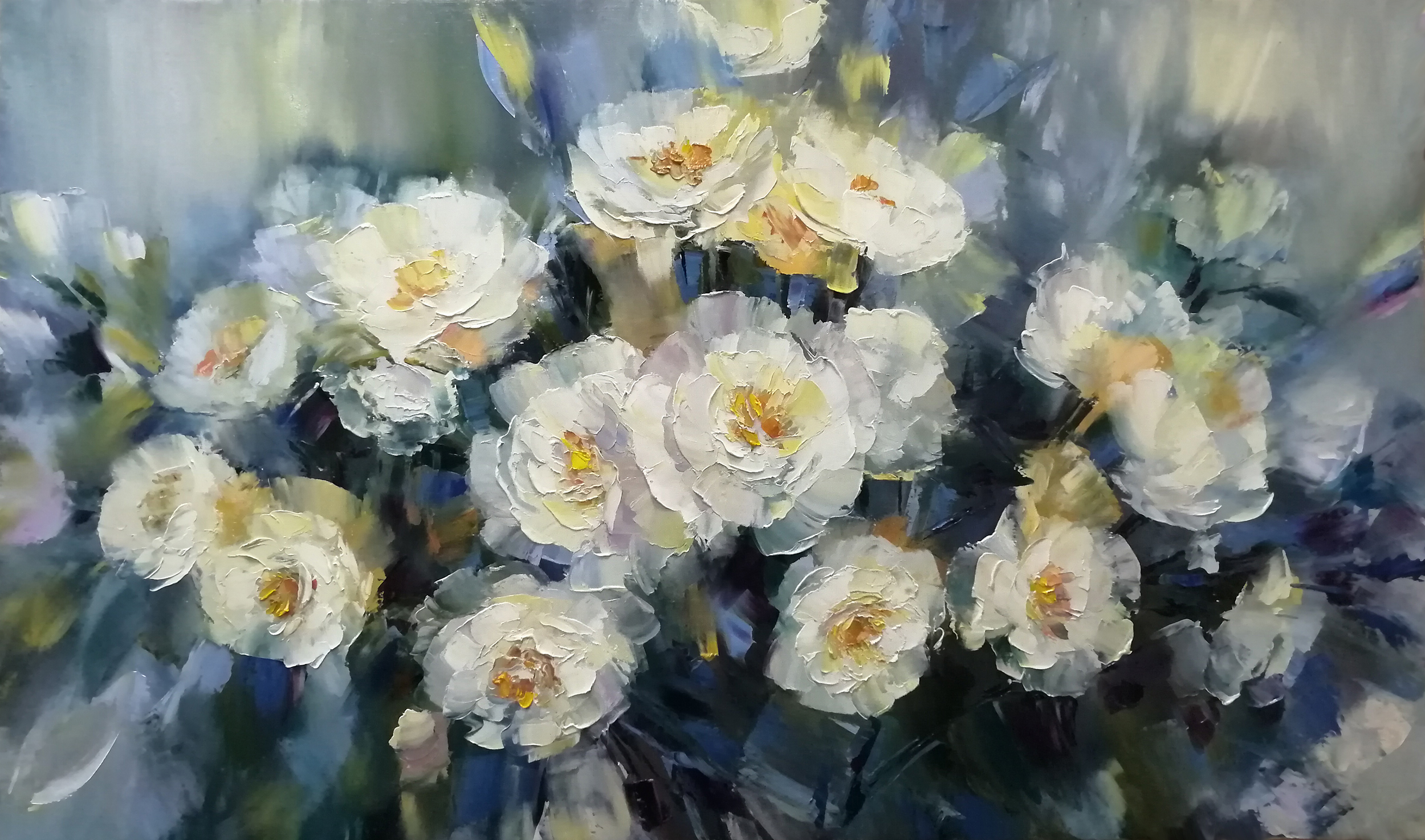 "Pearl necklace" is a surprisingly elegant and refined interpretation of a floral motif. The canvas depicts an aristocratic bouquet of large white flowers, shimmering with pearly, almost transparent shades under the gentle light. The artist masterfully works with texture, creating a soft glow and play of light on the petals. The deep cold background sets off the fragility and nobility of the flowers, enhancing the associations with pearls. This work is not just an interior decoration, but also a symbol of sophistication, femininity and purity. The painting will fill the space with radiance, freshness and tranquility, adding a touch of aristocratic charm.