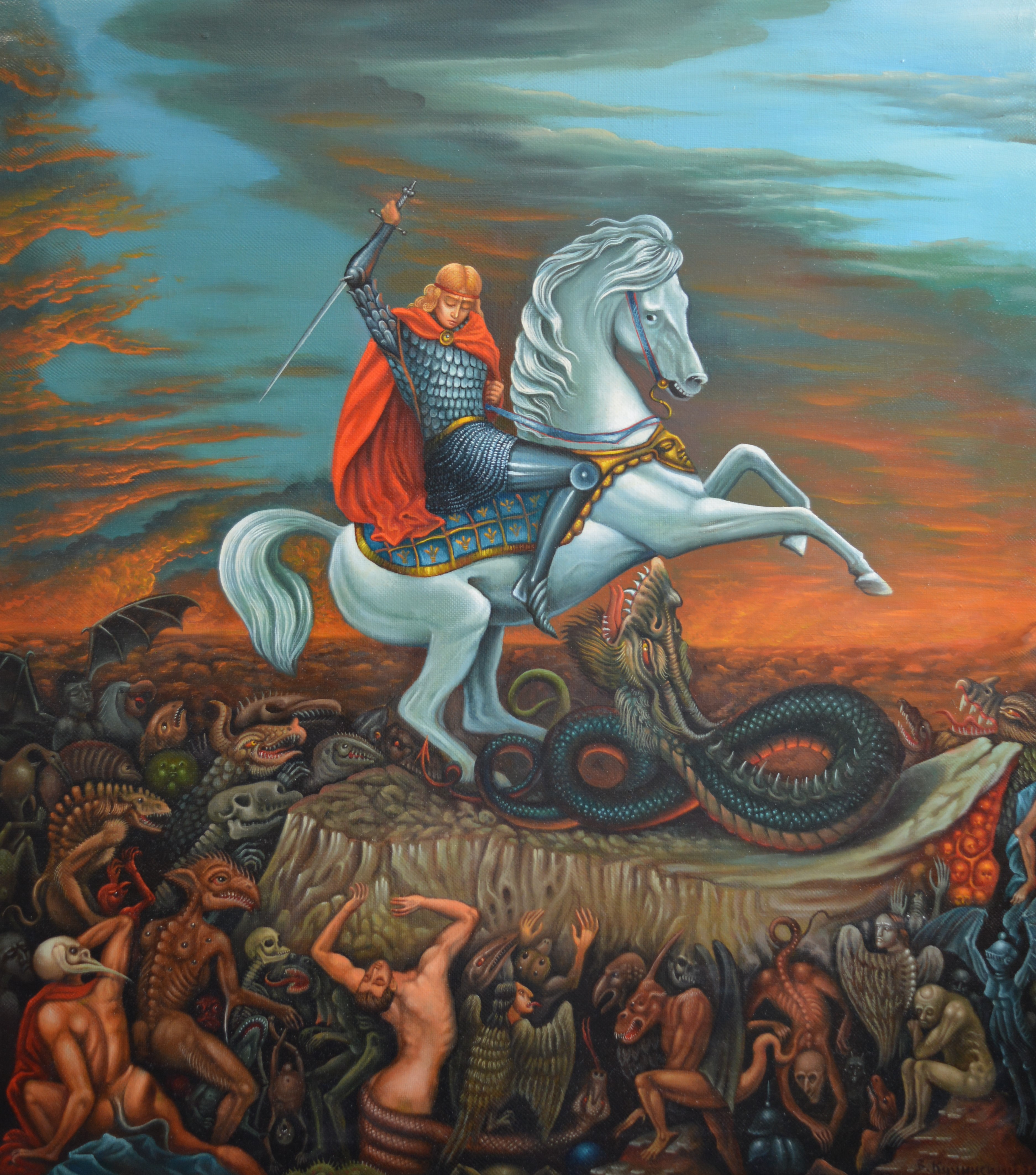 The picture “Legend” tells the viewer about the eternal struggle between good and evil, angels and demons, desires and passions ... in ourselves. Each person daily faces different facets of personality, understanding of what is happening around us, perception of the world around us. We struggle with ourselves every day, sometimes showing perseverance in judgments, thoughts, actions... and sometimes, we give in to a simple want, desire, dream... and then a dark world awaits us. It is often said that on our shoulders sit two, an angel and a demon, who try to tempt and mislead or guide to the path of truth. The painting shows us how our inner world in the form of a rider on a horse defeats the serpent (selfishness, but even after defeating him, we begin to be surrounded by a world of gossip and intrigue, desires, passions and momentary weaknesses. The world in which we live is often clear to us, we see and hear it, we think we understand it. But the world inside us is a battlefield, the outcome of which will determine our outlook and resilience.