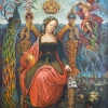 The woman’s clothing, executed in various shades of red, blue, and gold, is decorated with intricate patterns resembling ancient writings or magical symbols. The clothing seems to be vestments emphasizing her high status and her connection with higher powers. The crown hovering above the woman’s head symbolizes her power, majesty, and divine origin.