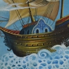 A sailboat sailing across the sky seems to be a symbol of travel, adventure, and freedom. Its white sails, fluttering in the wind, create a sense of movement and liveliness. The sailboat seems to carry the girl to distant lands and unexplored worlds.