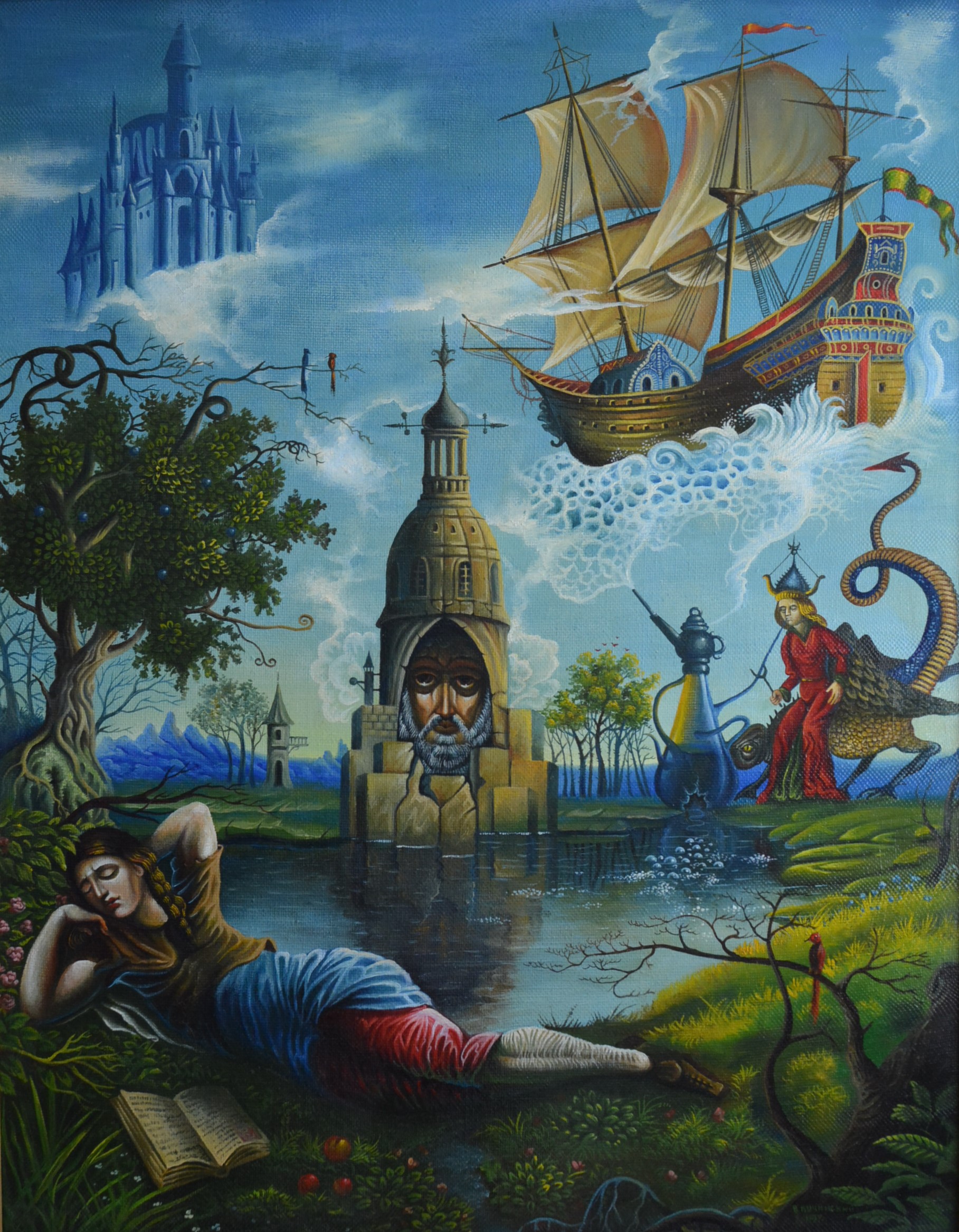 At the center of attention of the painting is a girl sleeping on the shore of a lake. Her pose, relaxed and uninhibited, expresses a deep immersion in the world of dreams. Next to her lies an open book, like a source of knowledge, inspiration, and fantasy. The girl seems to be the key to this dream world, its guide and creator.