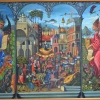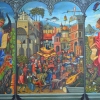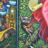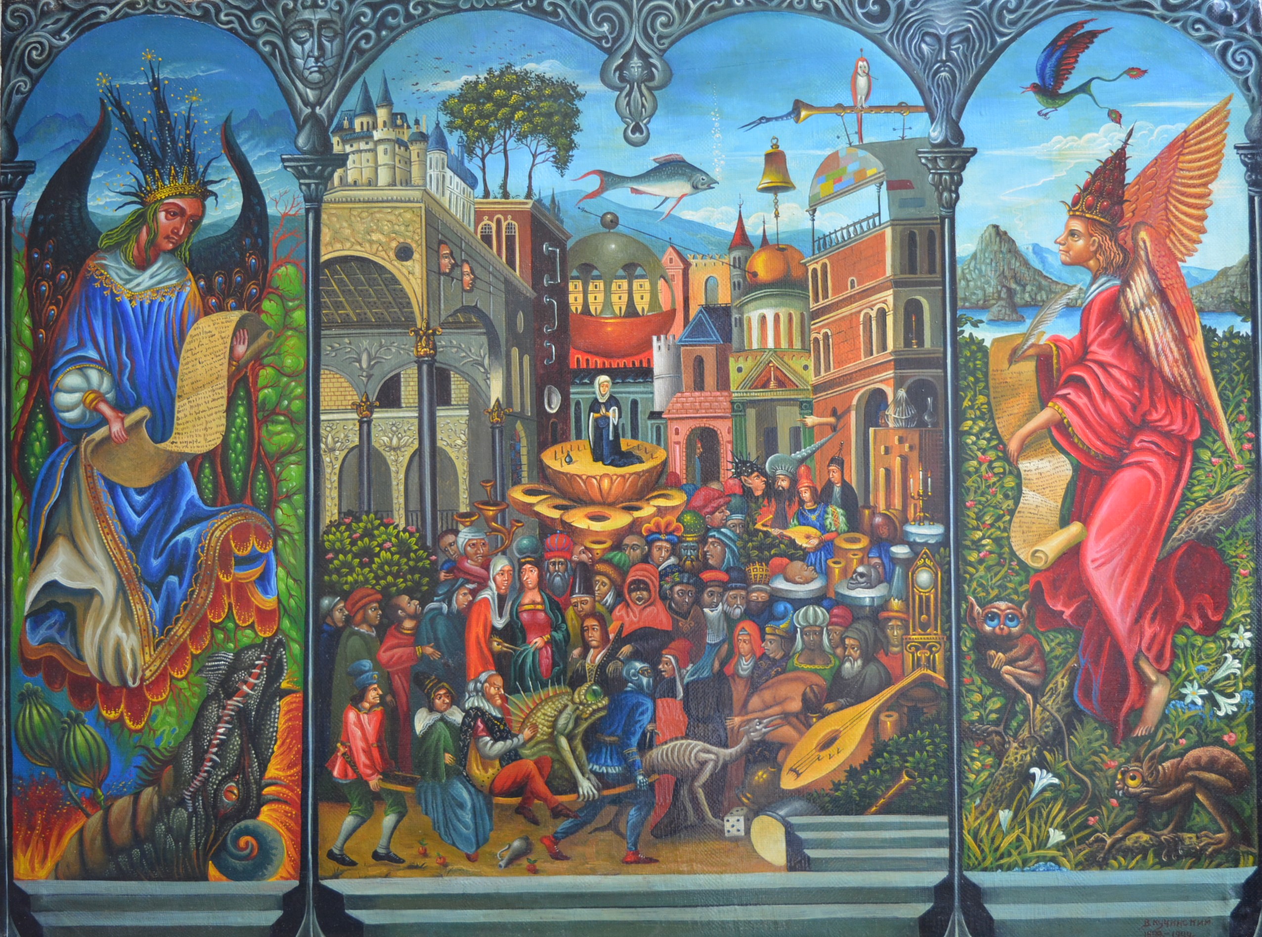 The painting "Bosсhomania" opens for the viewer the idea of Jerome Bosch but with an interpretation of the author. Written on one canvas triptych, immerses the viewer in a fantastic world of illusions and magic. The lateral parts of the picture with images of angels seem to emphasize their attitude to the mystical and unearthly world. Each of the angels holds its own scroll describing the life and deeds of man. Also next to the left image of the angel, we see a dragon and a poppy plant, which represents the dream of the mind. On the right side are fabulous animals seeing in the dark. The middle of the picture is filled with human characters living in vice and illusion. So this world is arranged that people do not think about their actions in a fuss of life.