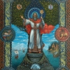 The background of the painting is a complex ornament executed in bright, saturated colors. This ornament seems to be a visual code containing information about the secrets of the universe.