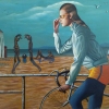 A special feature of the painting is that the cyclist is depicted against the background of an unusual landscape that combines elements of reality and fantasy. On the one hand, you can see the sea, sky, and sandy beach, creating a sense of space and freedom. On the other hand, there are strange objects and figures on the beach: surreal sculptures, as well as sunbathing people. These objects, like elements of a dream or fantasy, add an element of unreality and mystery to the landscape.