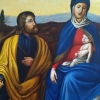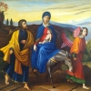 Next to her are two men. One, in a yellow cloak, supports the donkey, helping her to walk. The other, in blue attire, walks alongside, as if protecting them from dangers. Their figures, executed in a realistic manner, emphasize the ordinariness of their lives and at the same time their devotion and readiness to follow their faith.