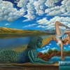 The background of the painting is a picturesque landscape, executed in bright, saturated tones. Mountains covered with green vegetation, a sky with lush clouds, and a water surface create a sense of spaciousness and depth. The landscape, like a reflection of the inner world of man, symbolizes harmony, beauty, and the eternal movement of life.