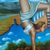 Next to the sphinx, on the right, is a female figure, executed in bright, saturated tones. She is in a pose resembling a gymnastic or acrobatic element, with a bent back and outstretched arms. Her legs are shod in sandals, and striped elements are visible on her body. The figure, like a dancer or priestess, performs some kind of ritual or dance. Her pose, flexible and graceful, expresses freedom and plasticity.