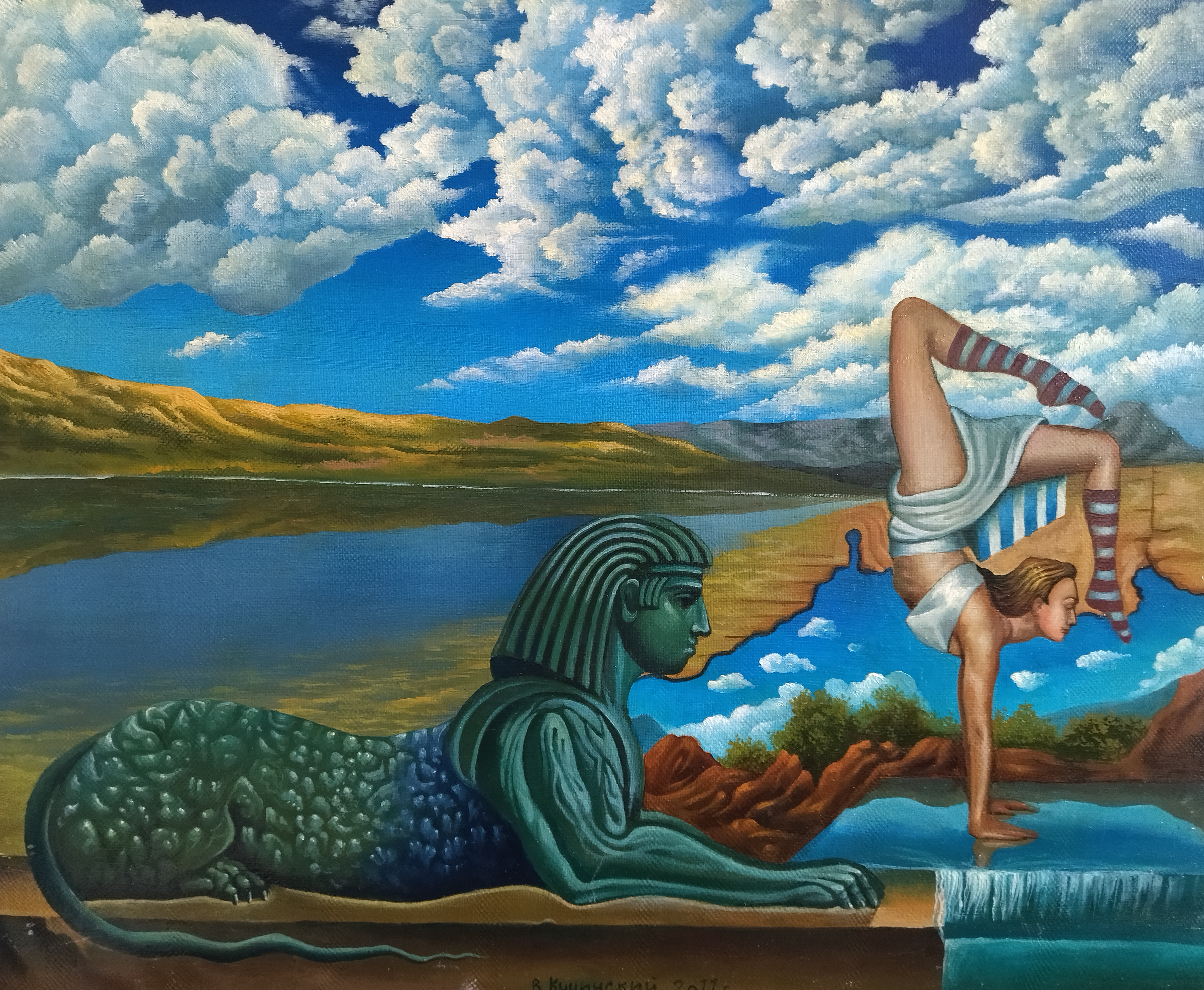 At the center of attention of the painting is a monumental figure of a sphinx, located in the foreground. Its body, executed in rich green tones, resembles the scaly skin of a reptile, and its head is a regal image with human features. The sphinx, like an ancient guardian, keeps the secrets of the past and is a witness to the eternal passage of time. Its gaze, directed into the distance, expresses wisdom and calmness.