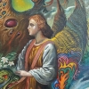 Vladimir Kuchinskiy’s painting “Dream” is a complex and multifaceted surreal composition, which intertwines motifs of dreams, fantasy, mysticism, and deep philosophical reflections on the human soul and its hidden possibilities. The artist uses a bright, saturated color palette and a detailed painting style to create an atmosphere of magic, mystery, and a certain anxiety, characteristic of the world of dreams. It is not just an image of a scene, but like a visual narrative of a journey through the subconscious, where all boundaries are erased, and reality is intertwined with fiction.