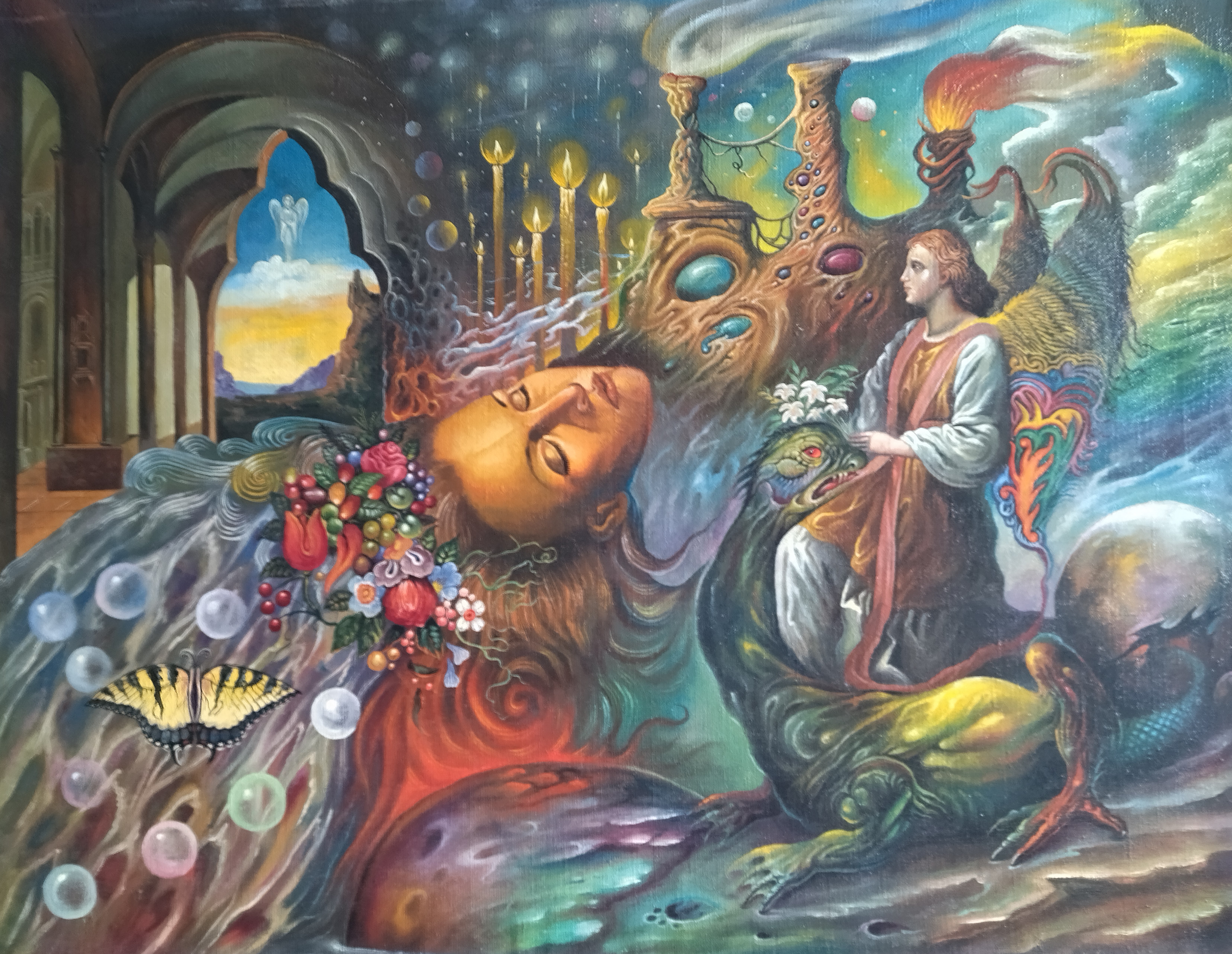 At the center of attention of the painting is the head of a sleeping person, occupying a significant part of the canvas. His face, calm and serene, expresses a deep immersion in the world of dreams. His eyes are closed, which emphasizes his detachment from the outside world and his complete immersion in the internal. Flowers, crystals, and other fantastic objects grow from the sleeping person’s hair, which symbolizes the fertility of imagination and the richness of the inner world.