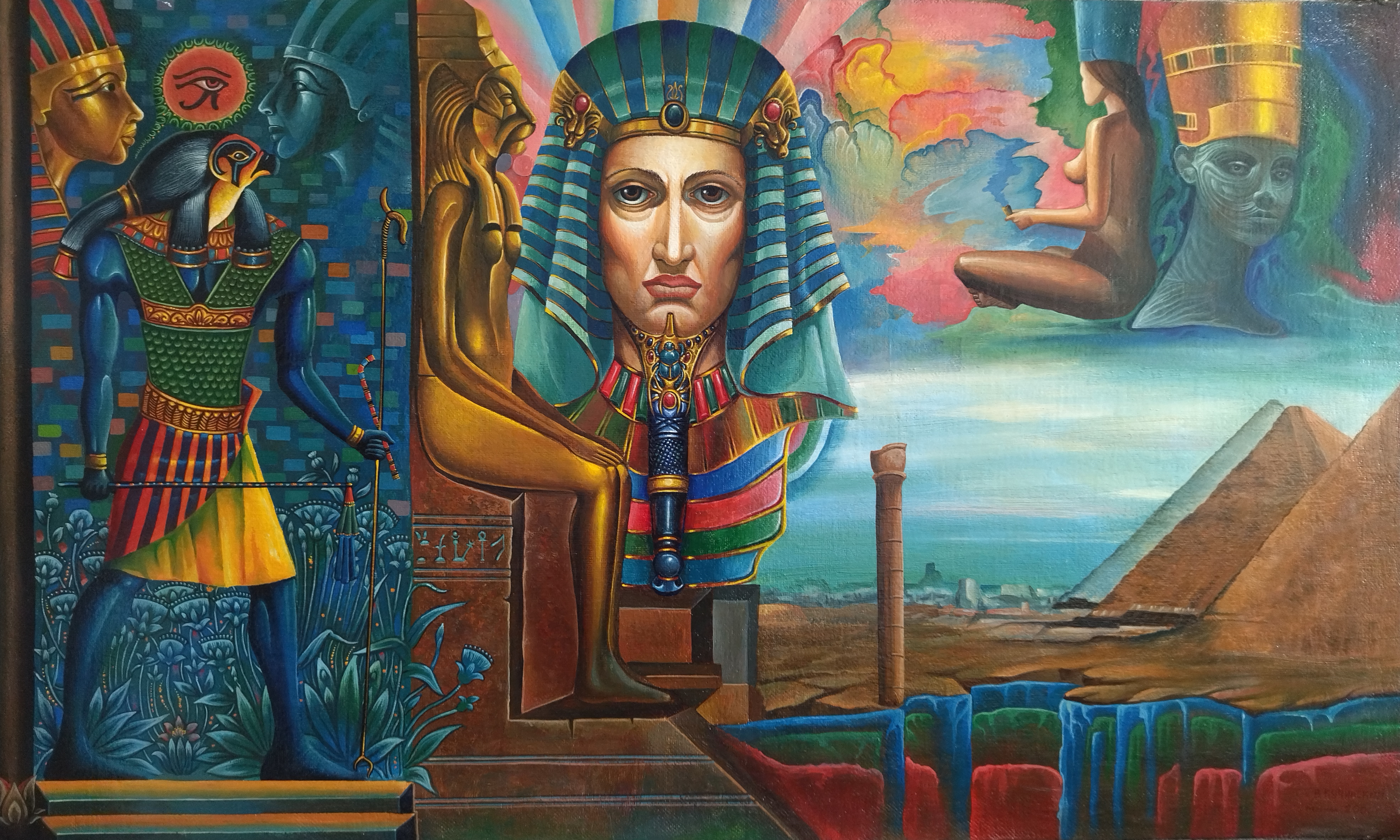 Vladimir Kuchinskiy’s painting “Egyptian Mysteries” is a monumental canvas filled with symbolism and references to the culture of Ancient Egypt. The artist uses a bright, saturated color palette and a detailed painting style to create an atmosphere of grandeur, mystery, and mystical knowledge characteristic of this ancient civilization. It is not just an image of Egyptian motifs, but like an immersion into the world of pharaohs, gods, and spirits, filled with reflections on life, death, and eternity.