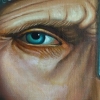 At the center of attention of the painting is the face of the warrior, largely depicted in the foreground. His gaze, direct and stern, is directed at the viewer, penetrating into the very soul. The face, furrowed with wrinkles, is as if written with a story, testifying to long years of service, battles, and hardships experienced. The artist does not idealize the facial features but rather conveys his severity and masculinity, emphasizing the strong-willed chin, tightly compressed lips, and piercing gaze.