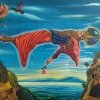Vladimir Kuchinskiy’s painting “Attempt at Levitation” is a mesmerizing surrealistic composition in which the artist explores the theme of flight, liberation from earthly bonds, and the aspiration for something greater than ordinary reality. He uses a bright, saturated color palette and a detailed painting style to create an atmosphere of dreaminess, mystery, and slight anxiety, characteristic of the world of dreams and fantasies. It is not just an image of a scene, but like a visual metaphor for man’s striving for freedom, overcoming earthly gravity, and believing in the impossible.