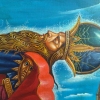 The background of the painting is a fantastic landscape that combines elements of different eras and cultures. To the right of the woman’s figure, a city with unusual architecture is visible, reminiscent of oriental palaces or temples. The buildings, executed in bright colors, seem to glow from within, creating a feeling of magic and enchantment.