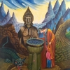 To the right of the bowl stands a man, dressed in bright, oriental clothes, leaning over the bowl. His pose, expressing concentration and tension, suggests that he is performing some kind of ritual or trying to look into the depths of his consciousness. Perhaps he is trying to remember the past or, conversely, to forget something important.