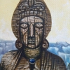 Next to the bowl stand two figures, the main characters of the painting. On the left is a monumental statue resembling an ancient deity or ruler. Her face, stern and silent, expresses eternity and immutability. The statue, like a keeper of ancient secrets, observes what is happening with indifference, but at the same time radiates powerful energy.