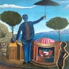 Vladimir Kuchinskiy’s painting “The Rain Man” is a surreal composition full of symbolism and philosophical reflections. The artist masterfully combines bright, saturated colors with grotesque forms and unexpected images, creating an atmosphere of absurdity, mystery, and an ironic view of the world. It is not just an image of a scene, but like a metaphorical narrative about life, fate, human nature, and man’s place in the world around him.