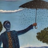 At the center of attention of the painting is the figure of a tall man, completely painted in blue. His disproportionately large head, as if floating above his body, and his gaze directed to the side, create a sense of detachment and a certain otherworldly nature. He holds a black umbrella over himself, from which rain pours. This man, like a master of the elements, controls the rain and the weather, but at the same time remains lonely and detached.
