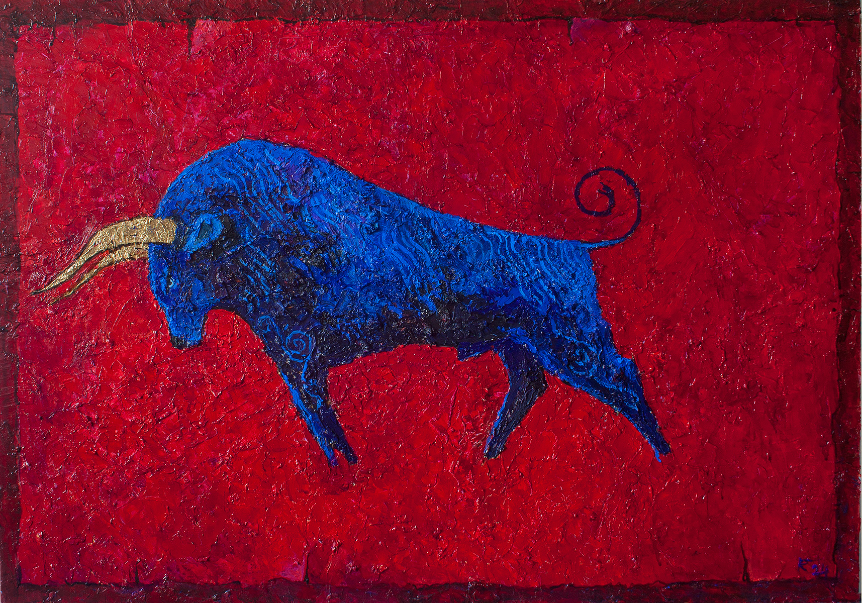 The painting "Blue Bull" impresses with the contrast of a powerful, bright blue silhouette of a bull against a rich scarlet background. This image conveys energy and inner charge, a symbol of courage and confidence. The textured surface of the canvas emphasizes the dynamics and expressive power of the work. This is not just an animal, but the embodiment of passion, freedom and inner strength.