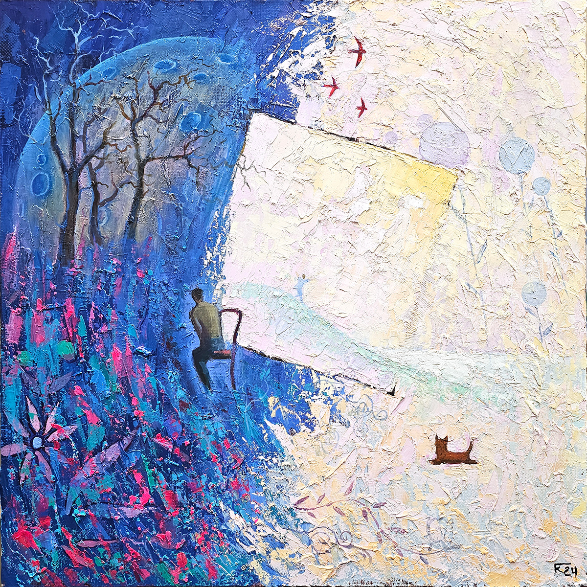 The composition immerses you in the mysterious atmosphere of a night filled with moonlight. The canvas is divided into two worlds: deep, dark blue and light, as if illuminated by a full moon. A single figure and a seated cat add lyricism, dreaminess and a sense of expectation of a miracle. The painting is about the magic of the night, inspiration and the search for harmony.