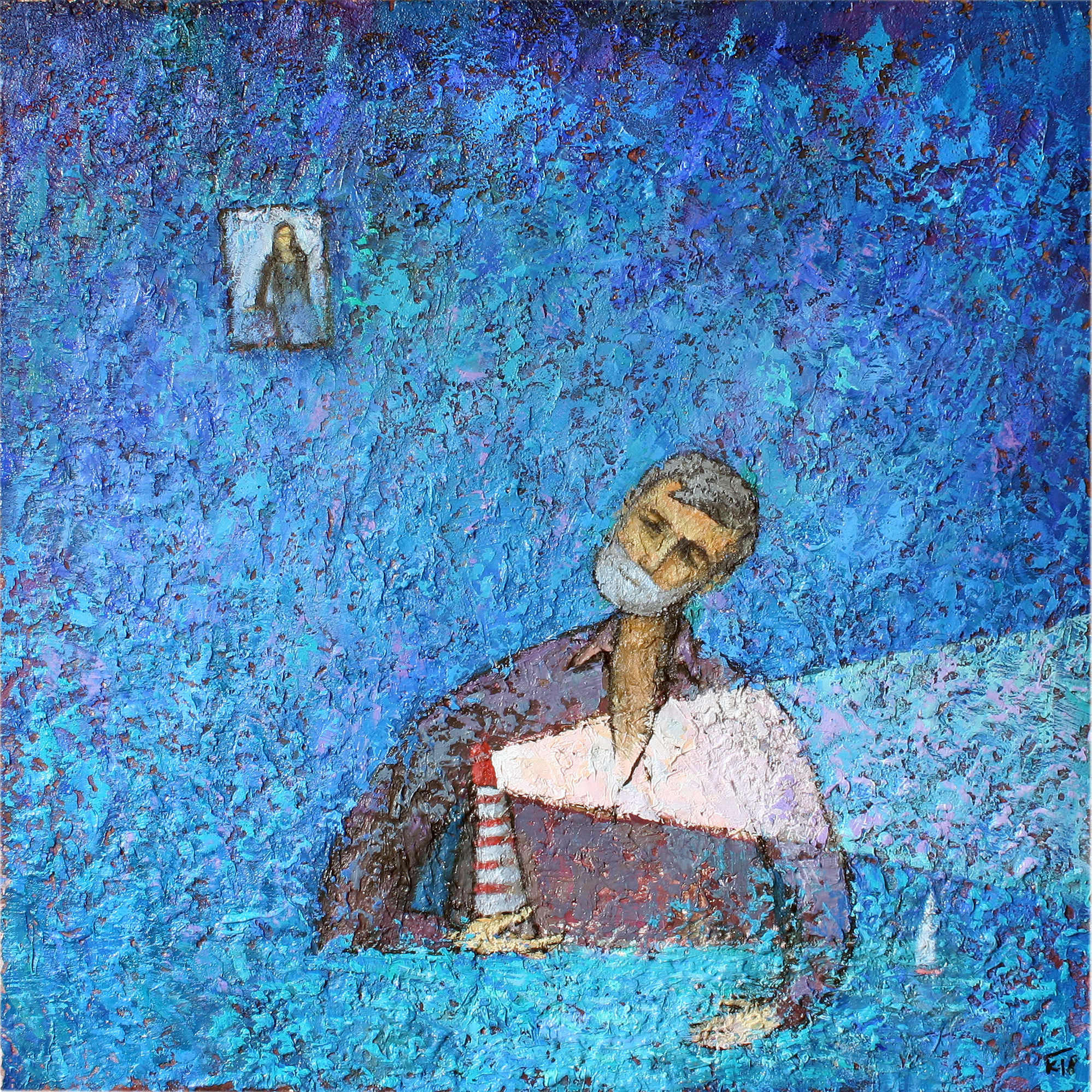 The painting is permeated with deep blue and turquoise light. In the center of the composition sits an elderly man (probably a lighthouse keeper), thoughtfully leaning on the table. His hand holds a miniature lighthouse - a symbol of service, hope and light in the night. The atmosphere is slightly mystical: the man looks up, and on the wall behind him hangs an icon, filling the scene with a sense of spirituality and purpose. The organic texture of the oil, dense swirling brushstrokes complement the soft, but very rich space. This painting is about human loneliness, faith and the world of inner concentration.