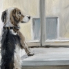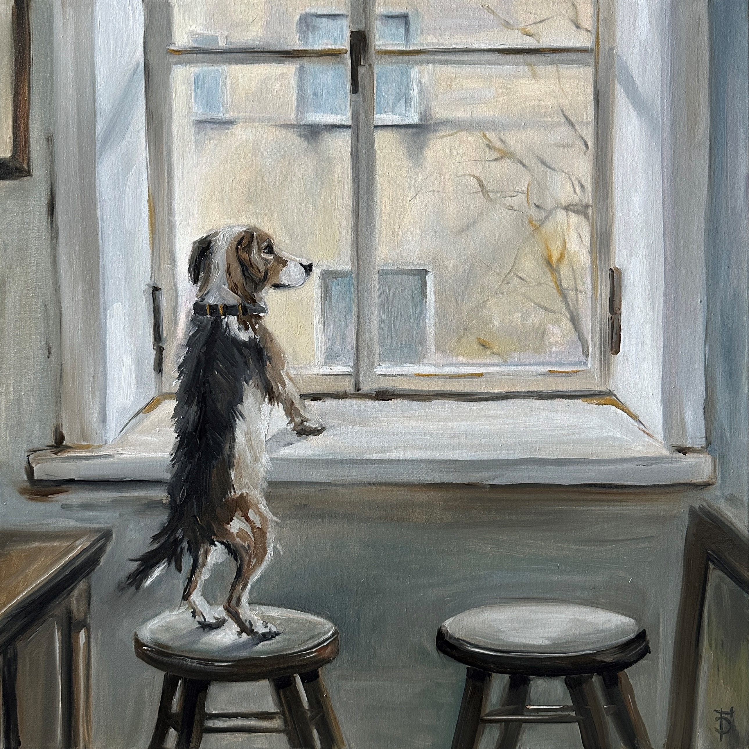 In the painting, the dog is frozen in anticipation, standing on a stool as if serving at his small post. She looks out the window with hope and devotion, she is waiting for the owner to return. In her pose, one can feel the attention and quiet faith that the long-awaited moment of meeting is about to come.