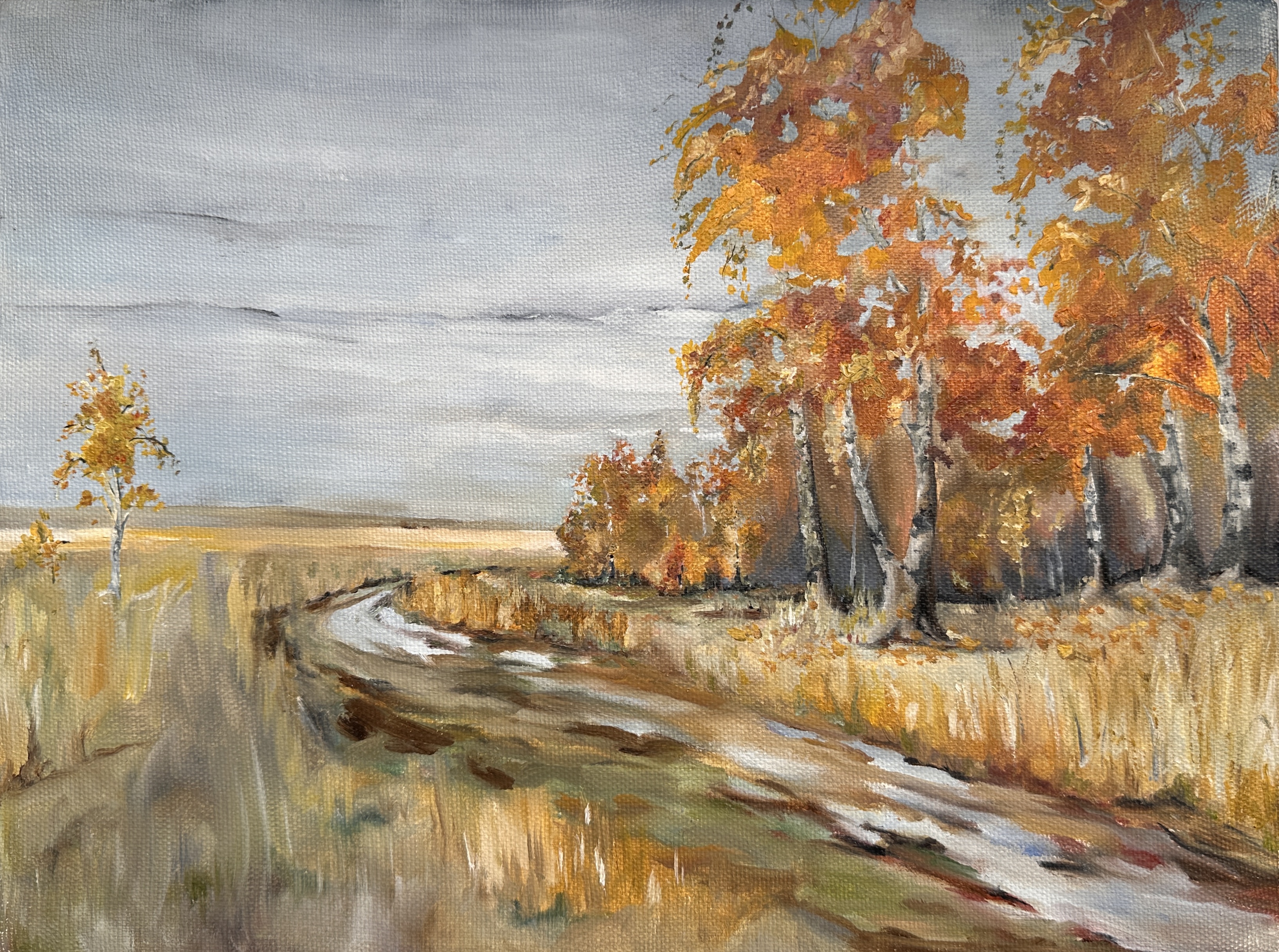 This painting is filled with the bright silence of autumn: the road gently recedes into the distance, inviting one to step toward something new, and the golden treetops glow brightly against a calm gray sky. Their fiery hues seem to illuminate the path, suggesting a farewell to summer and at the same time the promise of new roads, discoveries, and hopes.