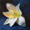 This small but very expressive canvas depicts a single lily flower. The snow-white petals are painted with great love and care - they seem to radiate a soft inner light, filling the space of the painting with tenderness and purity. Against the background of deep blue and brown shades, the petals look especially airy and fresh, like an ascending oasis of harmony and peace. A barely perceptible yellow hue at the base of the petals adds picturesqueness and warmth to the entire still life. The artist managed to convey the fragility and grace of the flower through a subtle play of light and shadow, inviting the viewer to hold their gaze and feel the charm of this fleeting moment of nature.