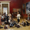 A genre scene of impressive scale and detail, revealing the atmosphere of museum life. In the foreground we see a group of students in school uniforms, seated on the parquet floor around a tour guide. He talks about the works of art, which is evident from the lively facial expressions and gestures of the participants. Around the children stand adults - teachers and parents, listening attentively or discussing what is happening among themselves. The room is filled with light, the walls are covered with dark burgundy paint, and on them are hung paintings and majestic sculptures. The depth of the hall is visible, creating the effect of presence inside the historical space. The painting masterfully conveys the dynamics of communication, the curiosity of children, the importance of cultural education. It is filled with life, history and the special atmosphere of a Russian museum.