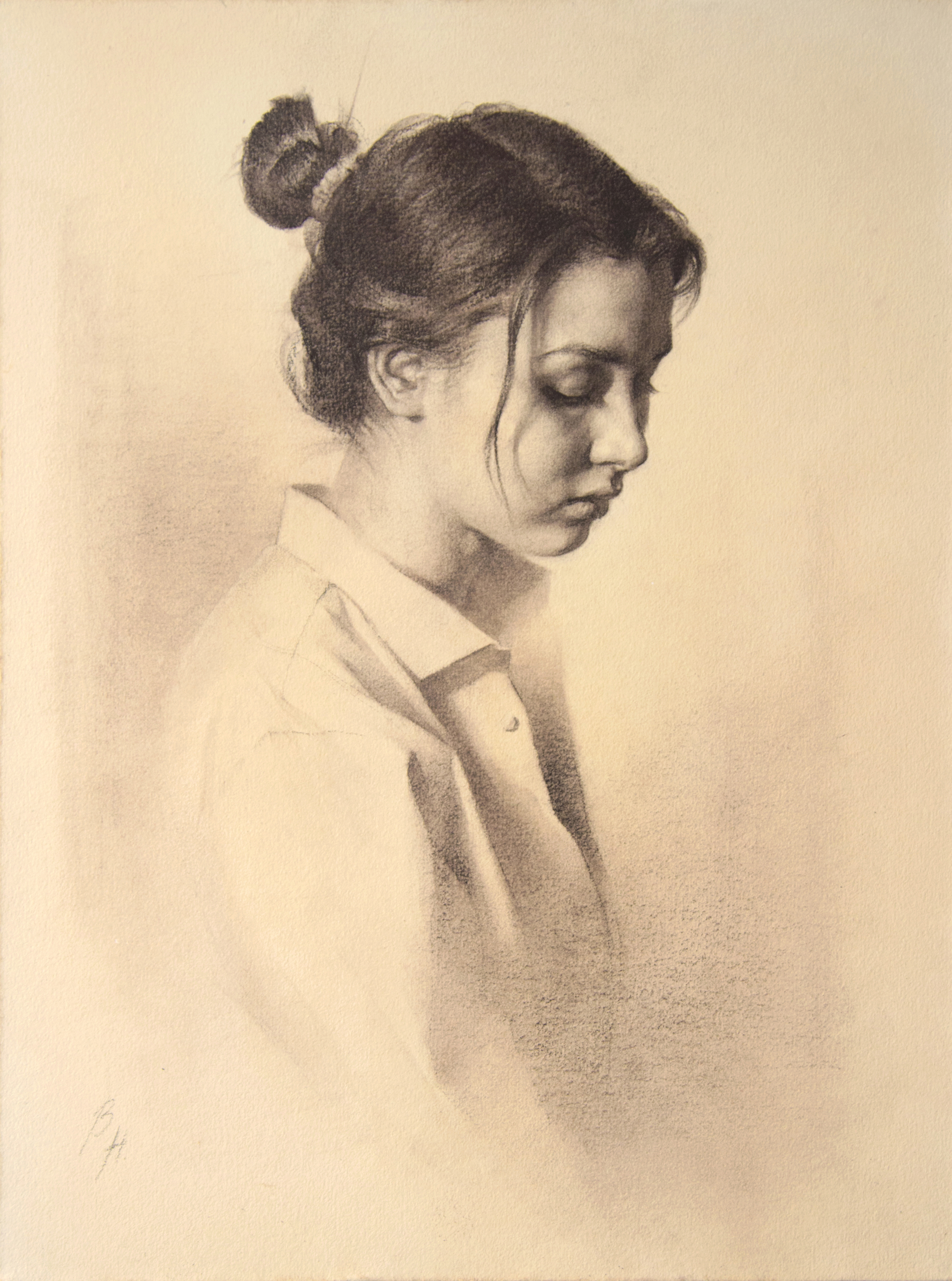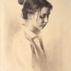 This is a chamber and heartfelt portrait of a young woman, executed in the author's graphic style. Liza is depicted in three-quarters, her gaze is lowered, her face reflects calm and slight thoughtfulness. Her hair is in a careless bun, several strands freely frame her cheek. Light, almost invisible shading provides a gentle chiaroscuro modeling of forms, adding softness and fragility to her image. Liza's soft blouse does not distract attention from the face and inner world of the portrait subject. The portrait turned out to be as reliable, natural, intimate as possible - it seems to invite the viewer to a quiet dialogue and contemplation of the heroine's inner state.