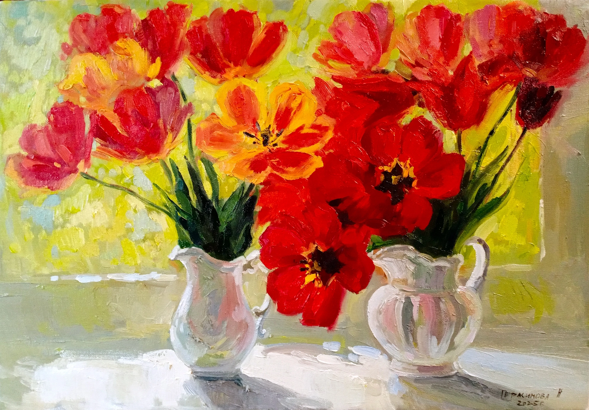 The background is made with short, energetic strokes of lemon, light green, and pearl tones, due to which the composition seems to glow from within. The flower petals, leaves, and surfaces of the jugs are finely crafted - you can see the play of highlights, reflections, and even light shadows, which gives the work volume and depth.