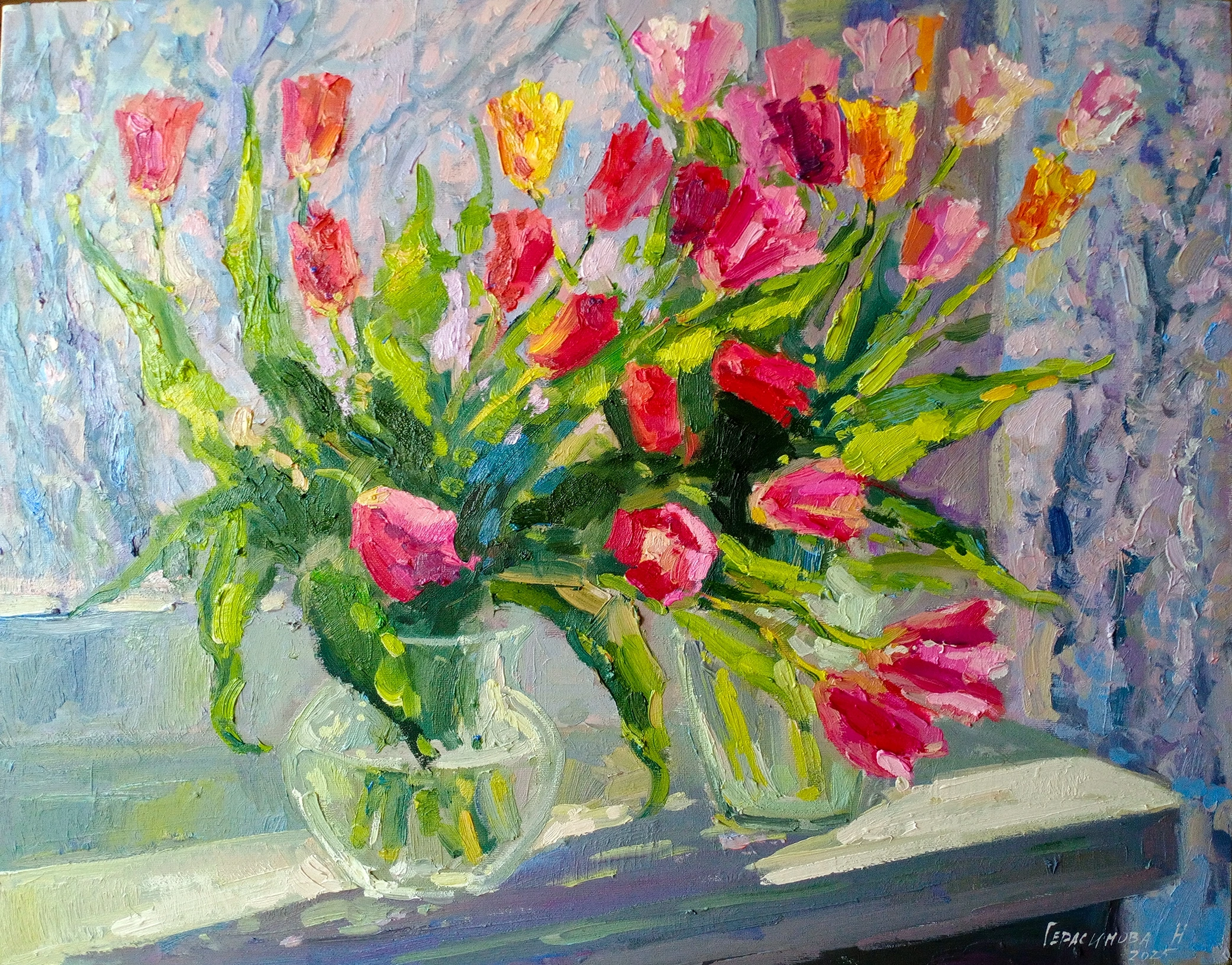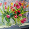 The painting "Spring" seems to absorb the joy, vitality and harmony of one of the most beloved seasons. In the foreground is a lush bouquet of tulips, proudly spreading their delicate inflorescences in a transparent glass vase standing on a light windowsill. The artist carefully draws every detail of these amazing flowers: rich pink, warm yellow and scarlet shades of buds echo each other, creating a feeling of riot and celebration. Green leaves are curved, supporting the composition and seeming to dissolve in the surrounding soft light.