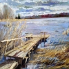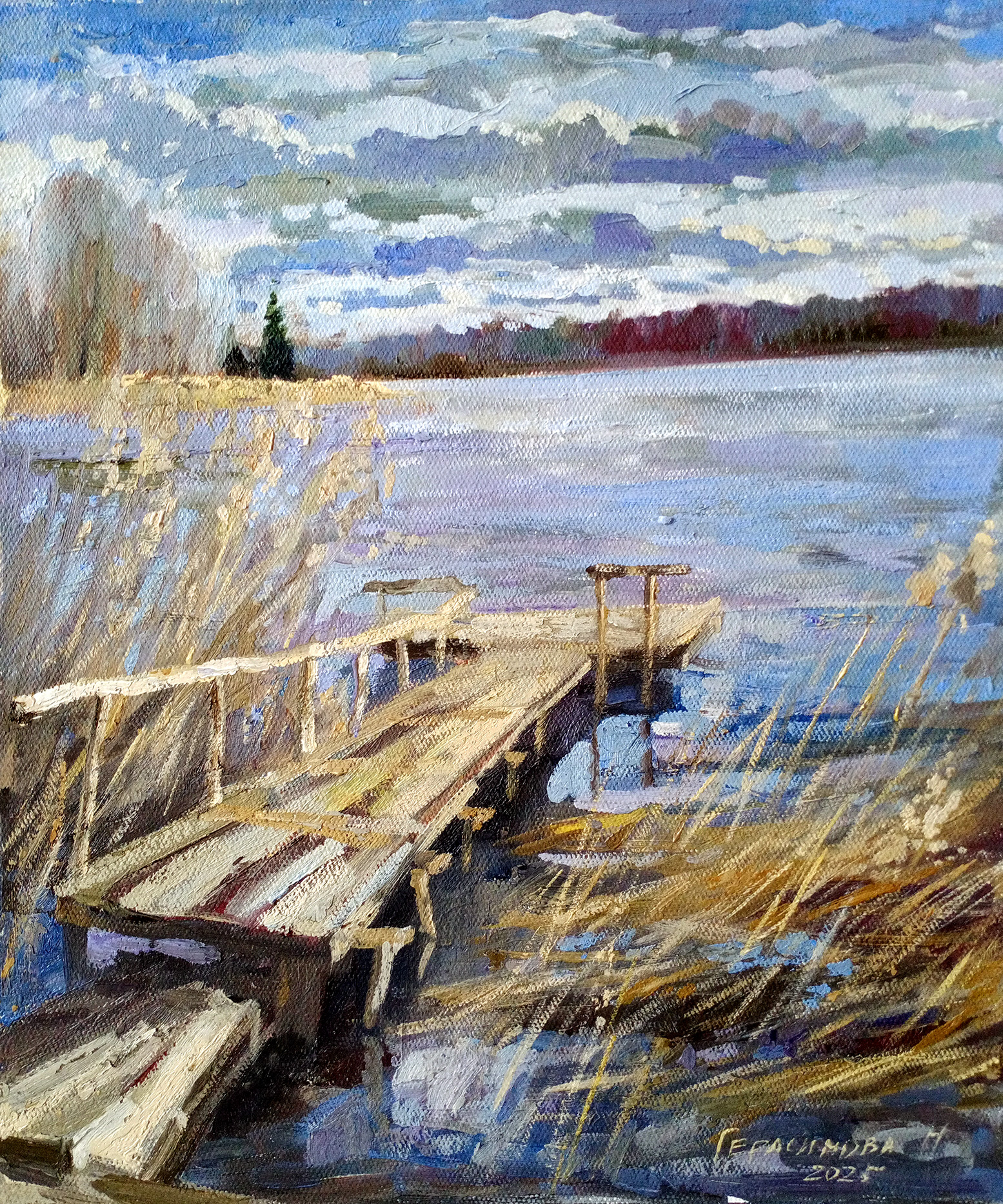 The shore is covered with young yellow-brown grass, and between the stems you can see the remains of last year's reeds. The tree branches along the edge of the painting create a sense of perspective and depth, framing and highlighting the pier against the background of the water - as a path to new impressions.