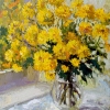 "September Chrysanthemums" is a true hymn to autumn freshness and exquisite beauty of nature. The painting depicts a transparent glass vessel filled with light and golden chrysanthemum inflorescences. Their fluffy petals seem light and airy, as if reflecting the pure September breath of autumn air.
