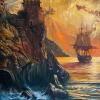 Azure waves carry a ship towards a rocky shore. The rocky island, overgrown with outlandish vegetation, seems to welcome the arrival of a long-awaited guest. At the top of the cliff, like a guard, stands a watchtower. The flag fluttering at its summit is silent, concealing its coat of arms in the folds of fabric illuminated by soft golden light.